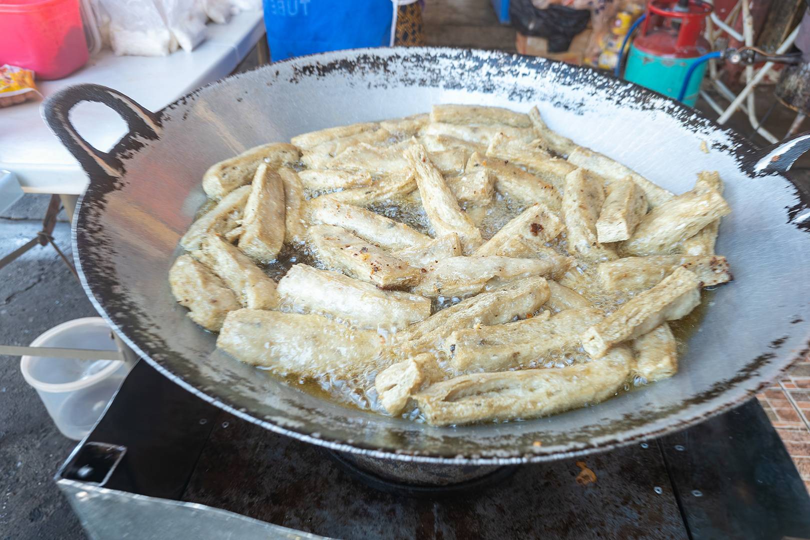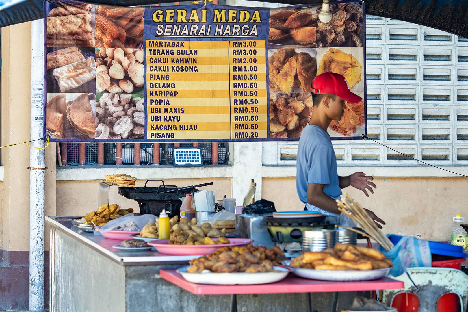 A little further on we arrived at the site of the enormous Tamu Market, which takes place weekly on Thursdays between 5.30 in the early morning and 12 noon. This market has been around for over a hundred years and draws people from far and wide. On the other days of the week there are only a handful of stalls with local snacks, fruit and vegetables. We lingered at one stall for a while. They had delicious drinks (Ki Sai Ping, an ice cold plum and lime drink, was very tasty) and also a popular local delicacy: deep-fried mackerel cakes on a stick. They were really delicious and Grace bought a large bag for us to take home.