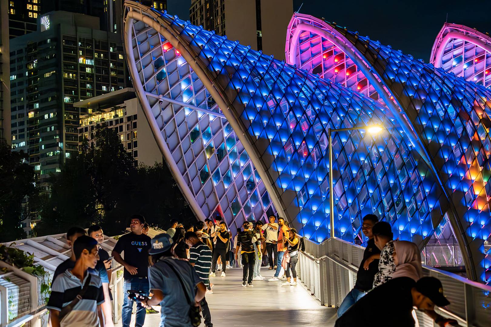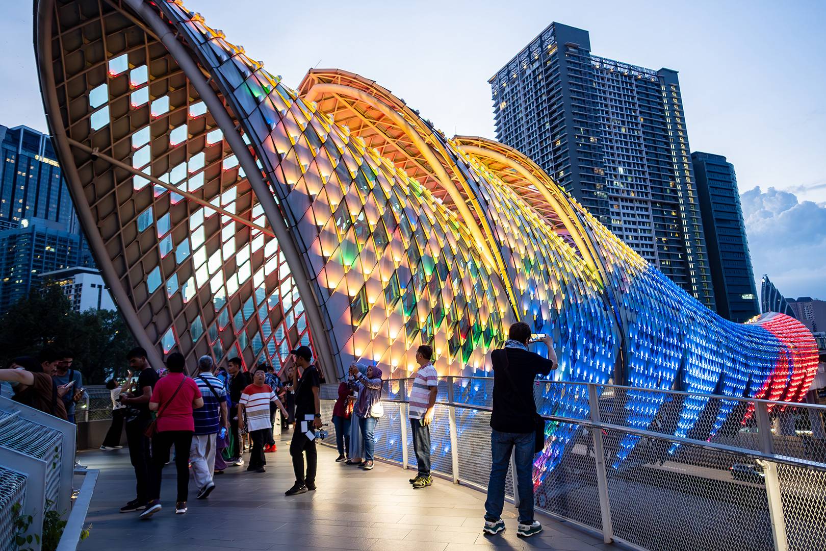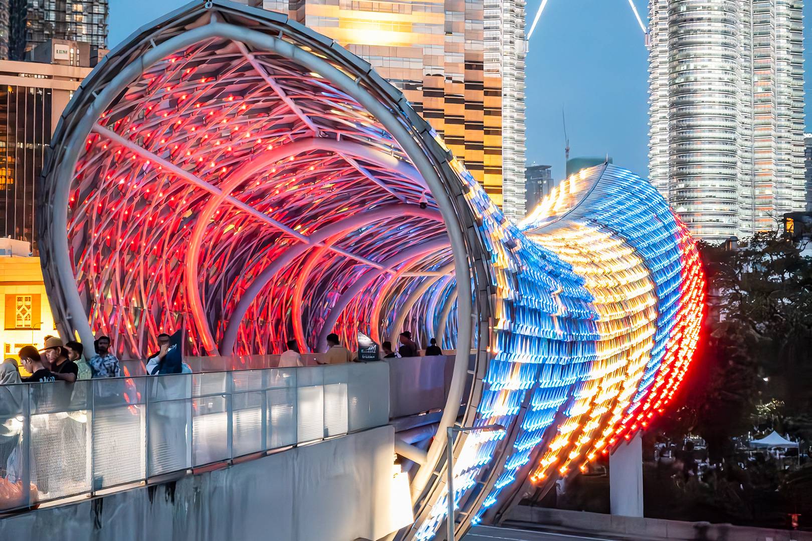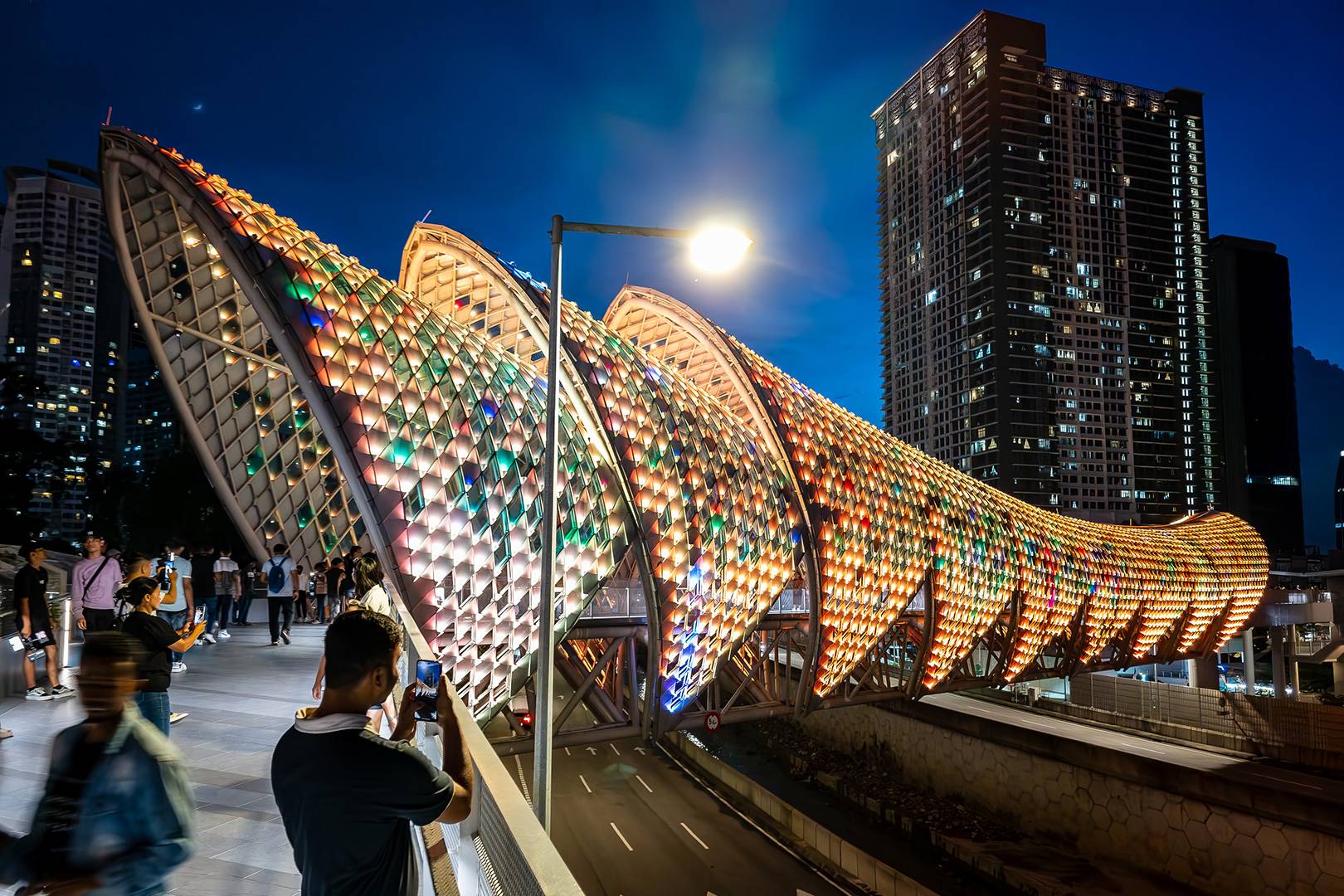 The design, inspired by the “Sireh Junjung” — a traditional arrangement of betel leaves used in Malaysian weddings — is a tribute to Malaysian culture. At night, the bridge transforms into a futuristic spectacle, lit up by thousands of LED lights that constantly change color. That’s one of the main reasons it’s become such a popular Instagram hotspot.