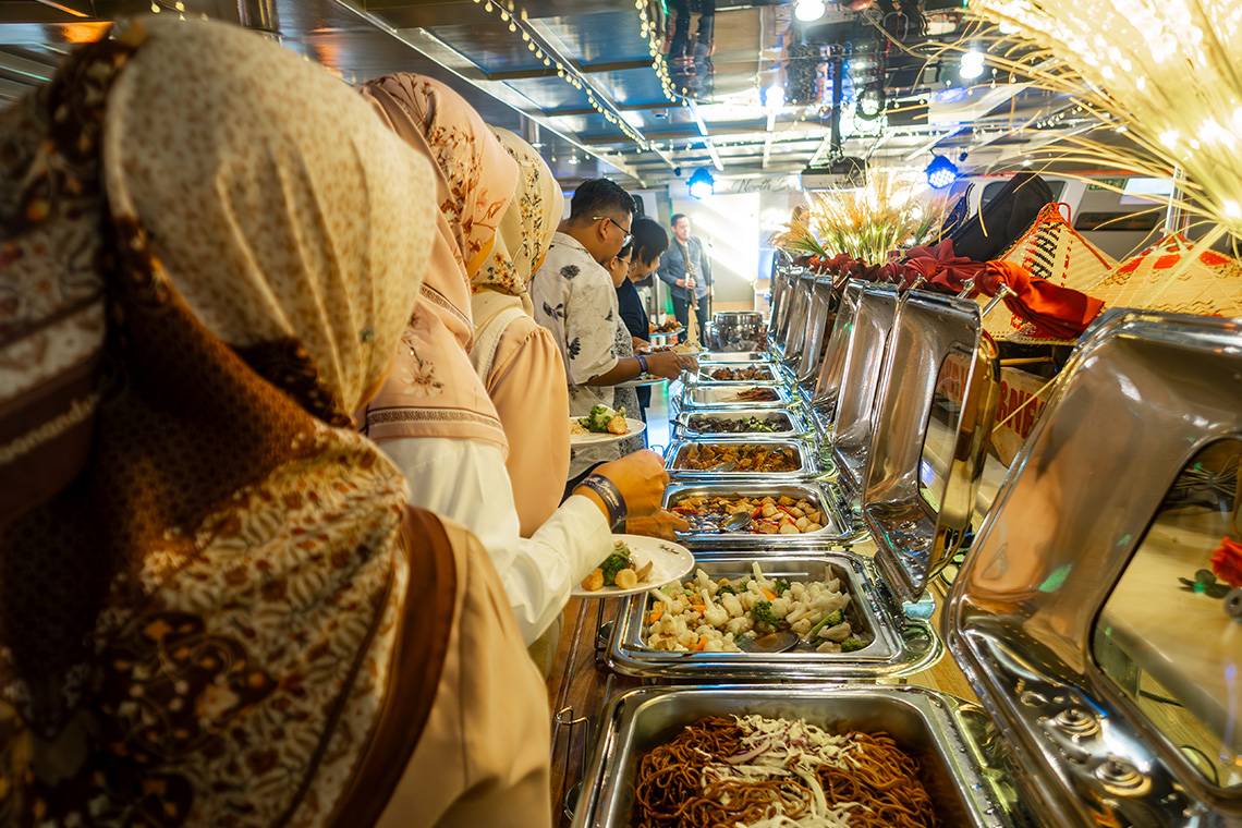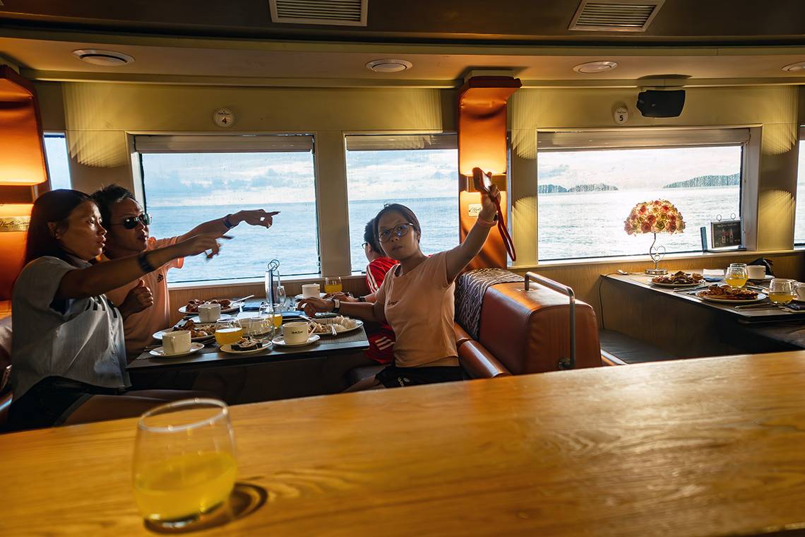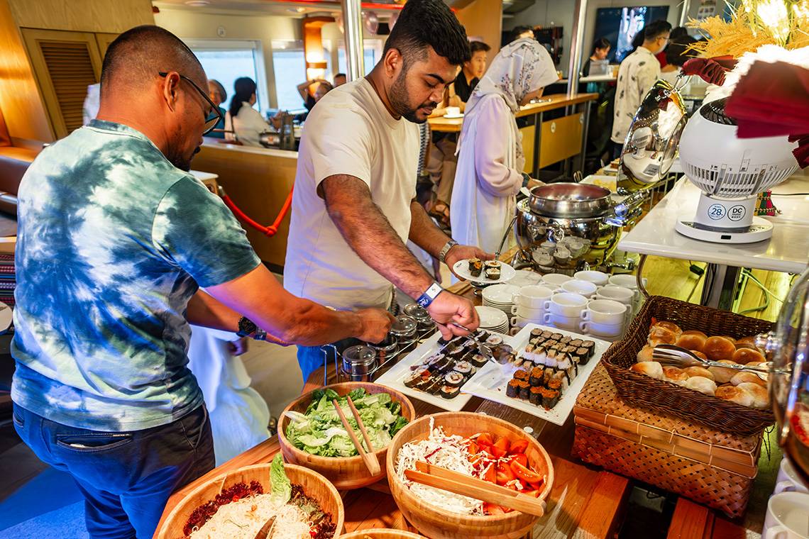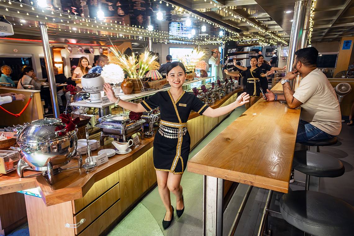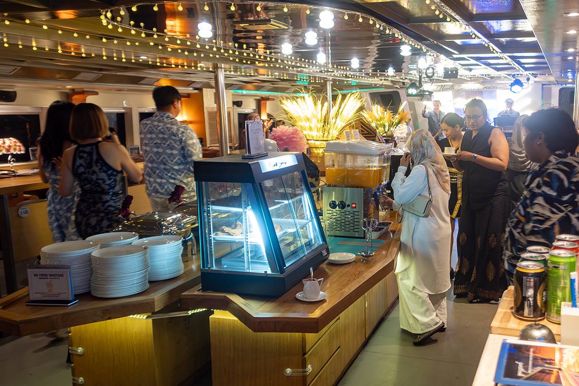 You would almost forget that people mainly book this cruise for the breathtaking sunset, because everyone seemed to linger below deck in the restaurant, waiting for the buffet dinner to commence. From the moment the captain announced that the buffet was open, everyone formed a line in order to fill up their dinner plates. A funny detail was that most international tourists waited (and looked in awe) until the first rush was over, while most of the local cruise passengers immediately got up to grab a plate. They seemed to know this game very well 😊.