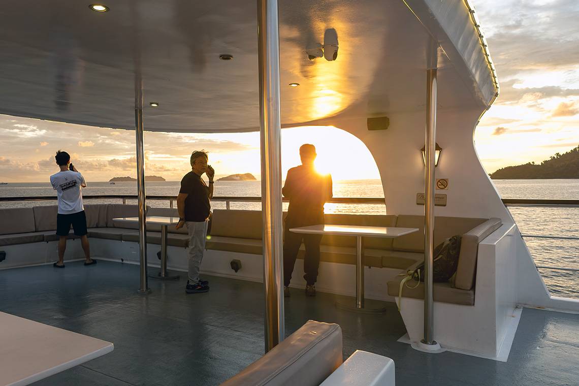 The boat navigates towards an open part of the sea with a full view of the coming sunset, usually roughly positioned between Pulau Gaya and Pulau Manukan. These two islands are part of the Tunku Abdul Rahman Marine Park, where you can relax and snorkel during the day.