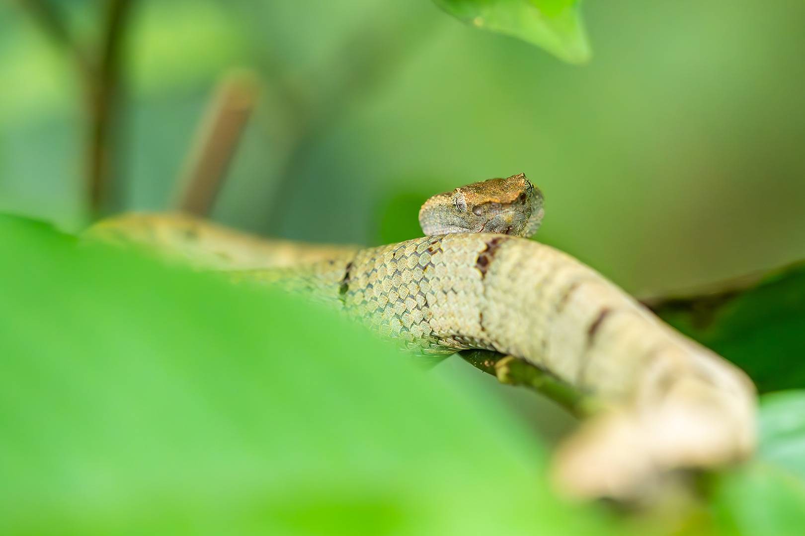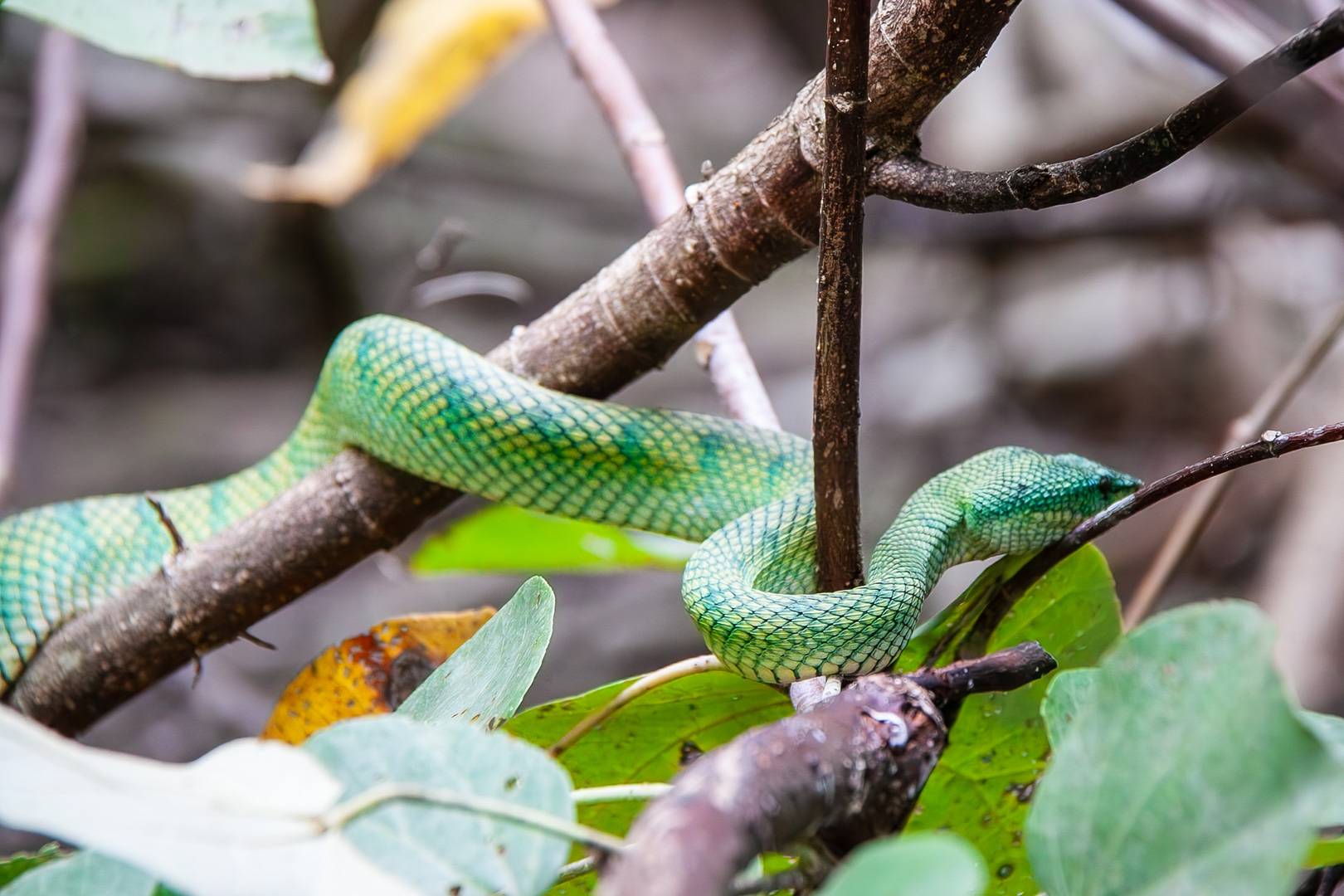 It’s important to have a camera that can handle water or a bit of rough use. Also, a bright (fast) lens is more important than just having a big zoom. A snake under the foliage on a branch is nearly impossible to photograph without a bright lens.
