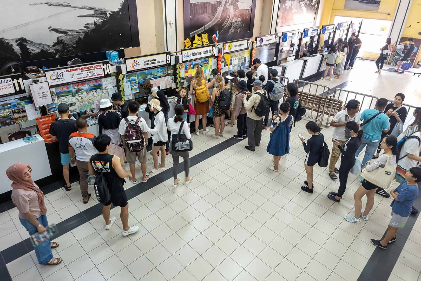 Buy your ticket at one of the counters — there’s a large signboard listing all the options and prices. You’ll need to provide your passport number and phone number (in case of emergency).